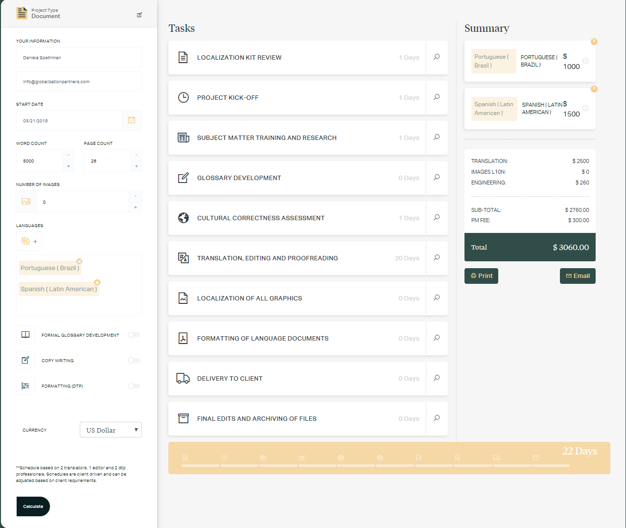 1. GPI’s Translation Portal has a Quick Quote Calculator to help you calculate a quote on a specific document translation project. It calculates the cost and schedule if you can provide the basic metrics of language pairs, word and page count. To use the Quick Quote Calculator, simply create an account on our Translation Services Portal.